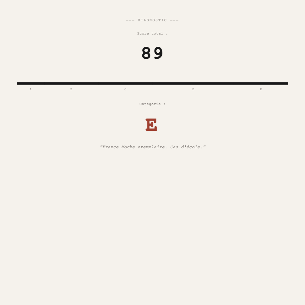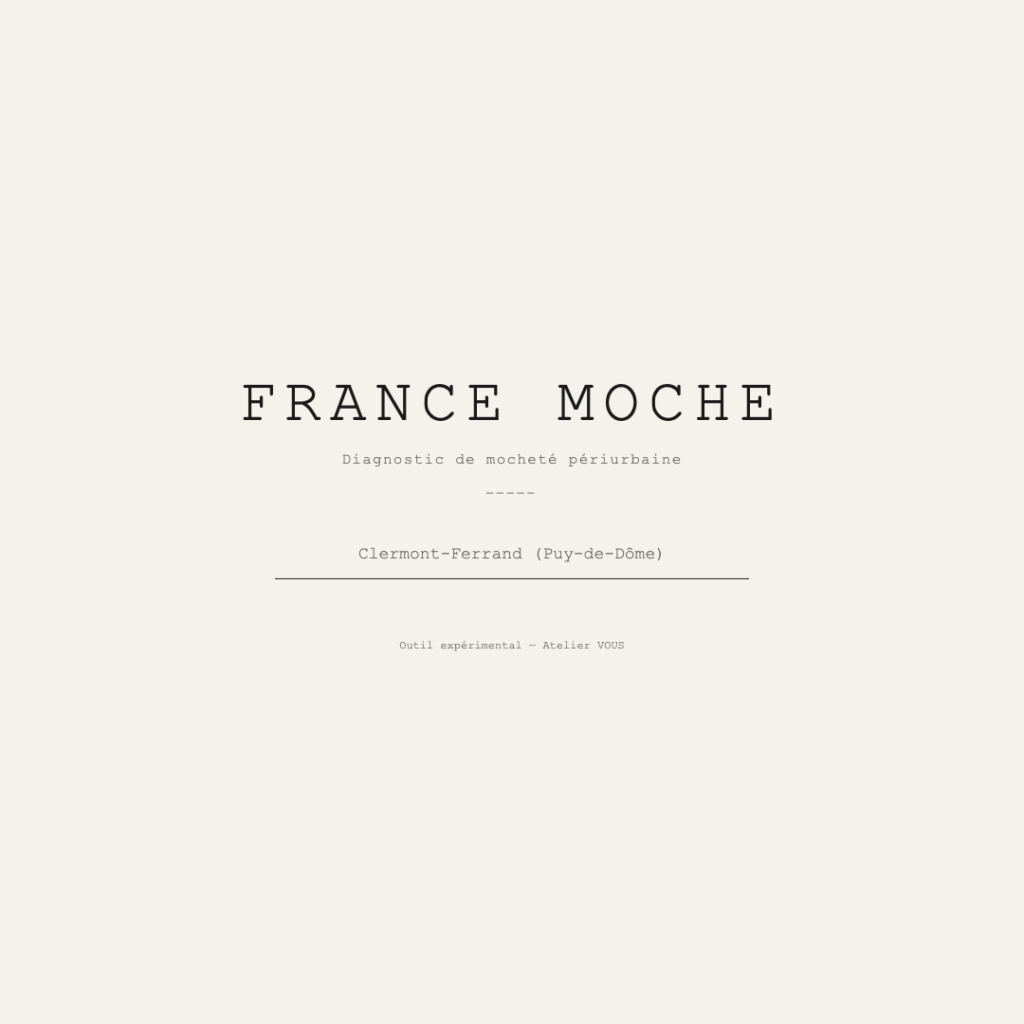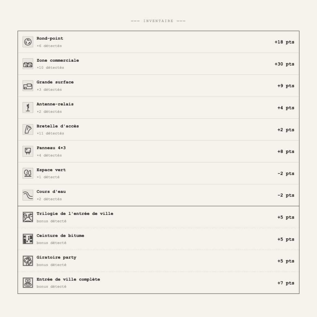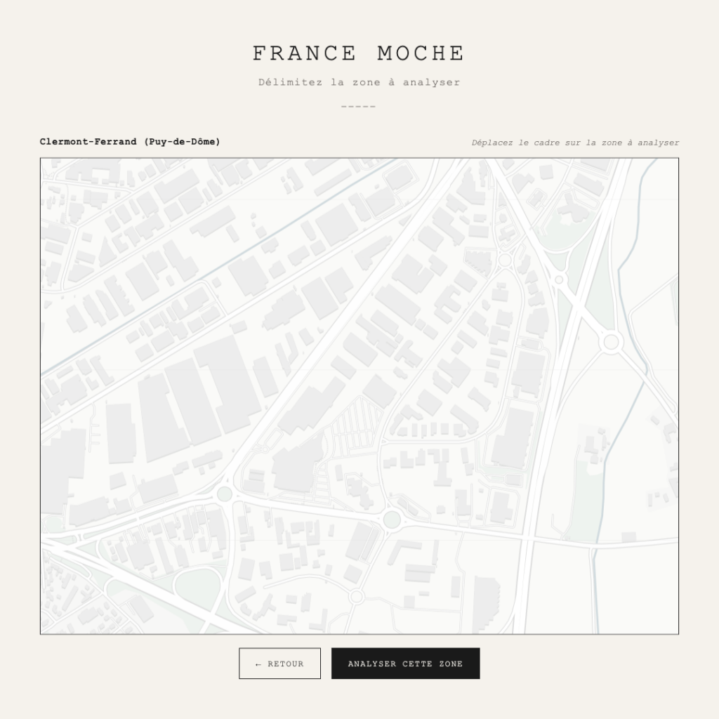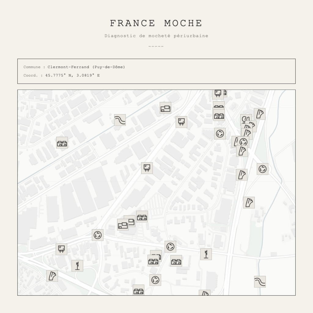 France Moche est un site expérimental qui s’appuie sur les données ouvertes d’OpenStreetMap pour produire une analyse concrète de ces paysages. L’utilisateur choisit une zone sur la carte, et le site identifie et géolocalise les éléments caractéristiques du périurbain : ronds-points, grandes surfaces, parkings, antennes-relais, fast-foods avec drive, bretelles d’autoroute, déchèteries. Chaque élément est compté, positionné sur la carte sous forme de pion, et scoré. Le résultat prend la forme d’un diagnostic qui emprunte autant à l’analyse de site qu’au jeu de société.